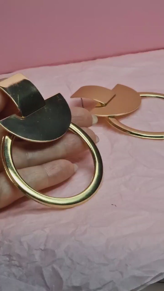 Bold Gold Geometric Hoop Earrings – Large Statement Circle Drop Earrings, Sculptural Modern Jewelry