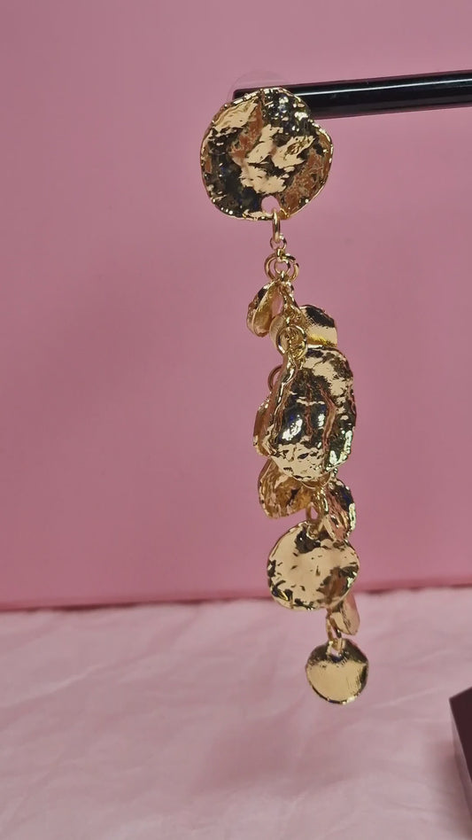 Gold Coin Cascade Statement Earrings – Long Textured Drop Earrings, Luxury Sculptural Jewelry